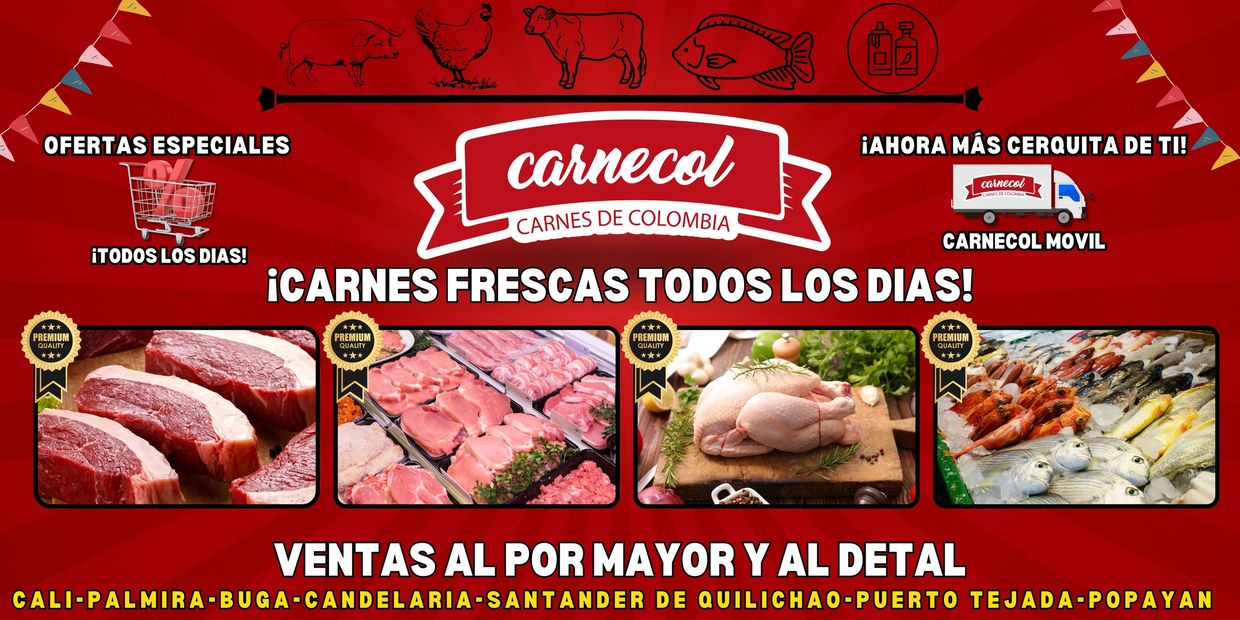 En Carnecol, nos dedicamos a ofrecer productos cárnicos frescos y embutidos de la más alta calidad a nuestros clientes, incluyendo hogares, restaurantes, hoteles, hospitales y grandes superficies en los departamentos del Valle del Cauca y Cauca. Con muchos años de experiencia en el mercado, nos comprometemos a brindar un excelente servicio basado en la honestidad, la experiencia y la humanidad, asegurando la legalidad en todas nuestras operaciones.